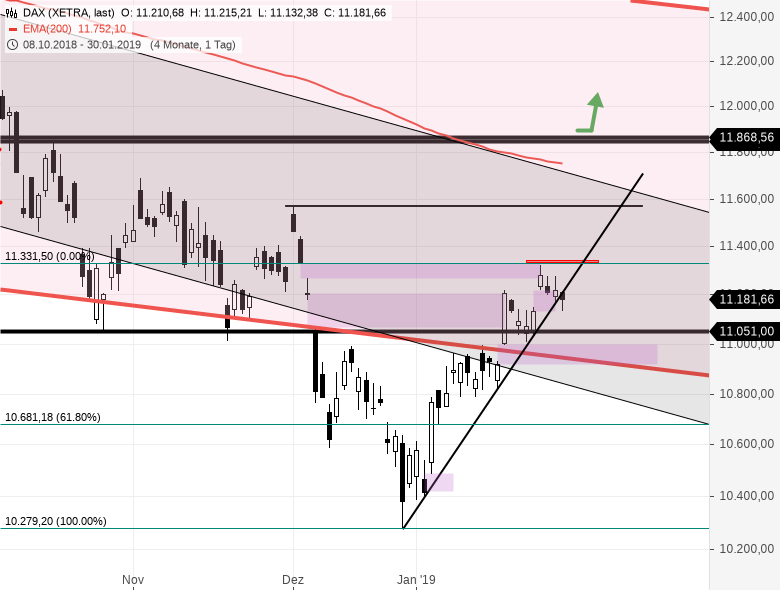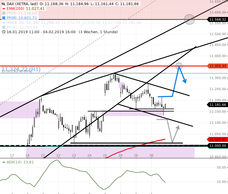 - Es ist zu unterstellen, dass ein Direktanstieg bis 11350/1355 realistisch ist, solange der DAX über 11160 handelt.