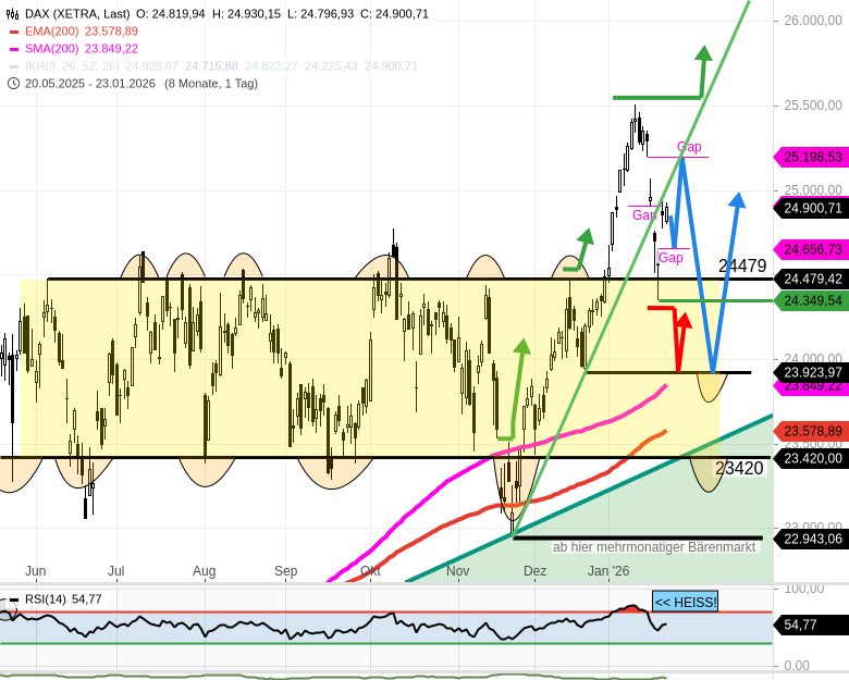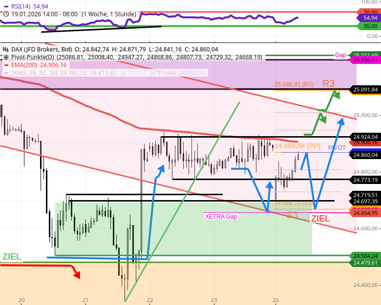 - 🟢 Bullisch: Steigt der DAX per Stundenschluss über 24925, so wäre das ein hinreichendes Zeichen dafür, dass der DAX heute Folgeanstiege bis 25000/25008 + 25087/25090 durchsetzen kann.