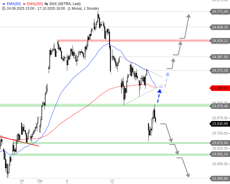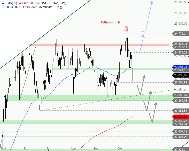 - Ein signifikanter Rückfall unter 23.830 hingegen wäre kritisch zu werten und würde ein bärisches Szenario für weiter fallende Kurse reaktivieren.