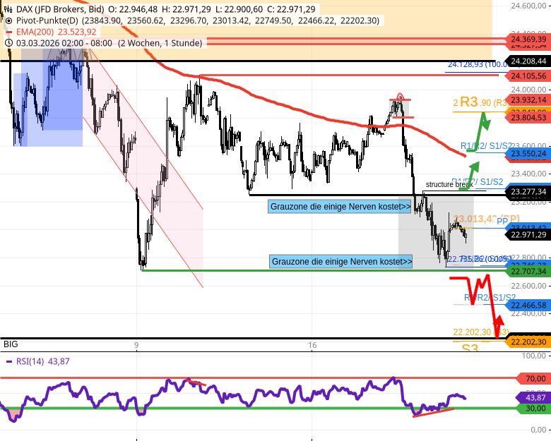- 🔴 Der DAX bricht unter 22700 stark ein bis zu 21279/21216 (Gap & Wochen-Pivot S3). Zwischenziele wären heute 22500 (Gap) und 22222/22200.