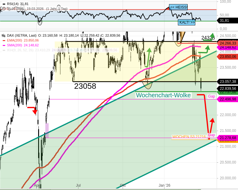 Der DAX näherte sich dabei stark dem jüngsten extremen Vorbörsentief vom 9. März bei 22707 an. - Die Oberkante des DAX Wochenkerzencharts bei 22737 verhinderte einen DAX Einbruch unter 22700.