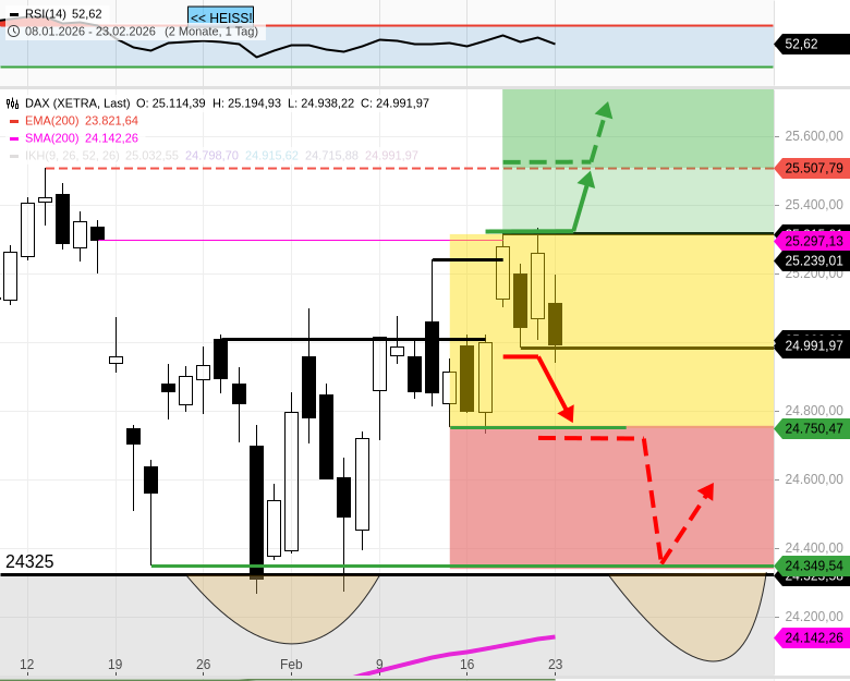 - Ein kleiner Unterstützungsbereich ist in der Vorbörse 25010 + 25000 (EMA200/h1 + runder Tausender).