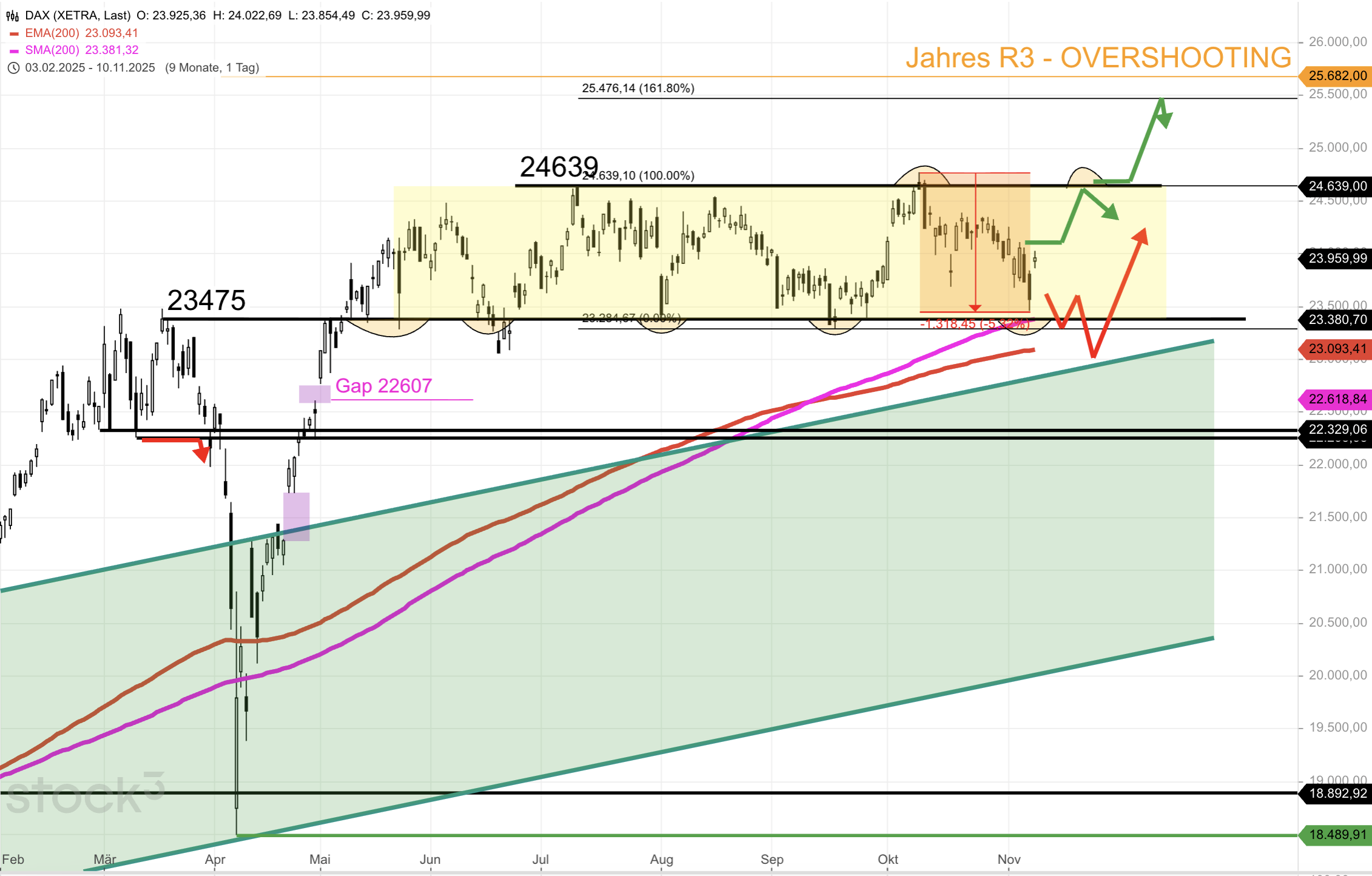 - Der DAX steht und fällt im Herbst mit der Zone 23475/23350. Darüber bleibt der DAX stabil, was gestern erneut bewiesen wurden, DAX Anstieg von 23450 bis 24120.
