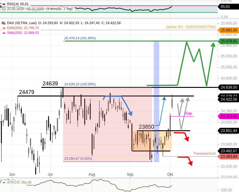 - 🟢 NEU! Nach DAX Tagesschlusskurs über 24639 schaltet sich das Kursziel 25476 frei.