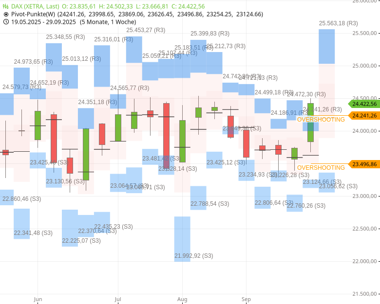 - DAX Ergänzung: Der DAX handelt bereits über Wochen-Pivot R3 (24241). Dieses Wochen-Vola-Level konnte im Jahr 2025 bisher kein einziges Mal per Wochenschluss überboten werden (zuletzt klappte das im Dezember 2024). Wir haben hier also aktuell ganz seltene DAX Vorgänge.