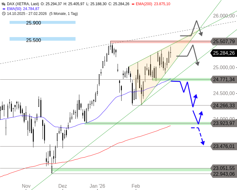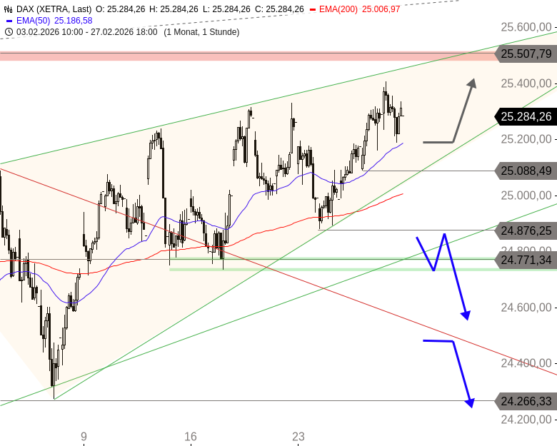 Der DAX dürfte nach der politischen Eskalation im Nahen Osten deutlich tiefer im Bereich von 24.750 Punkten eröffnen und damit die Topbildungs-Ansätze der vergangenen Woche bestätigen: In den letzten Tagen war der Index bereits in von starken Korrekturen durchzogenen, schrittweise kürzer werdenden Aufwärtsstrecken bis 25.405 Punkte gestiegen. Somit hatte sich ein bärischer Keil gebildet.