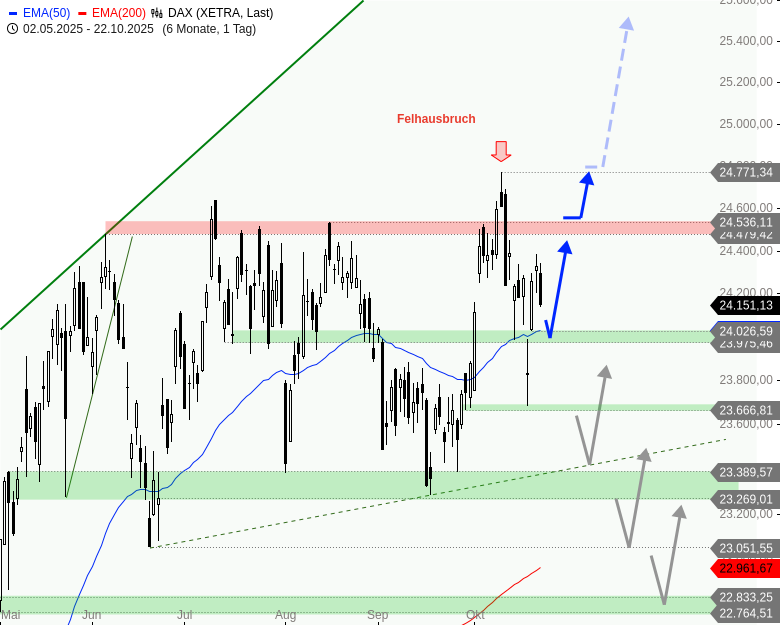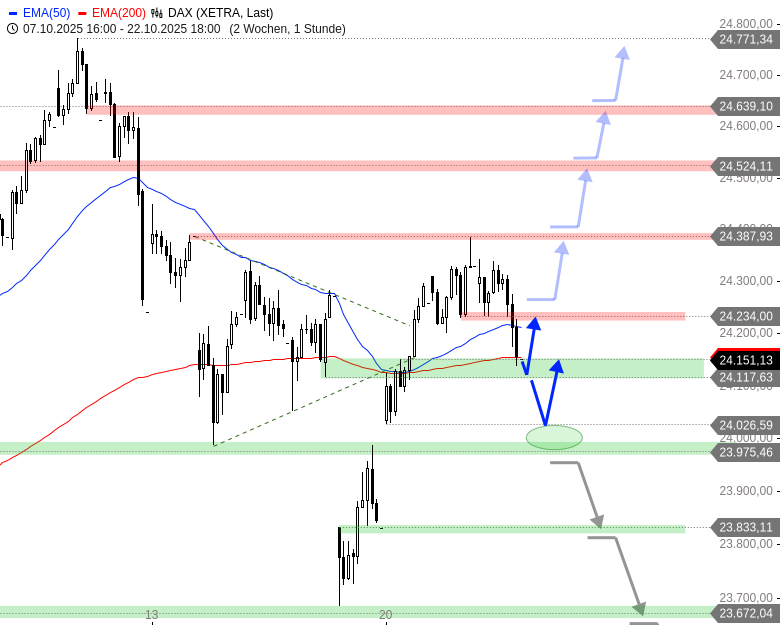 - Oberhalb davon könnte es dann wieder aufwärts gehen bis 24.388 und dann bis 24.524 oder 24.625 - 24.640 bzw. zum Allzeithoch bei 24.771. Kommt Verkaufsdruck auf, wäre ein Test der Supports bei 24.117 - 24.151 oder darunter 23.950 - 24.030 möglich, wo Reversalchancen bestehen.