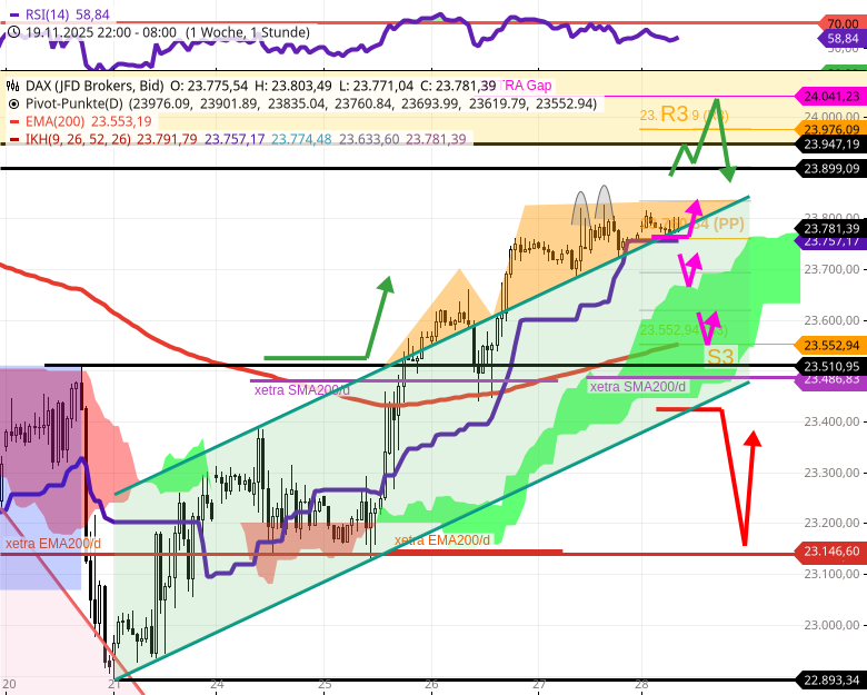 - 🔴Unter 23757 könnte der DAX bis zur h1/Wolkenoberkante 23668 fallen, die sich ab 14 Uhr auf 23692 erhöht und dann schon bei 23694 stützend wirkt.