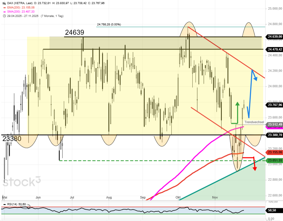 - Die DAX Bodenbildung wurde vollendet. Der Kampf um die 200-Tages-Linie ist gewonnen. Ausschlaggebend dafür war der DAX Tagesschluss über 23480/23510.