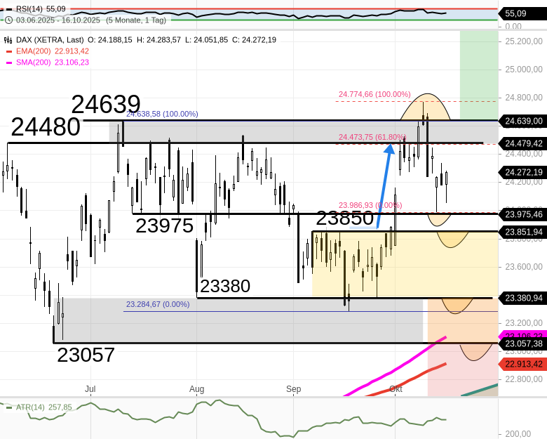 2) Fällt der DAX per Tagesschlusskurs unter 23850, dann käme es bis Ende Oktober noch zu einem kleinen DAX Einbruch bis 23380