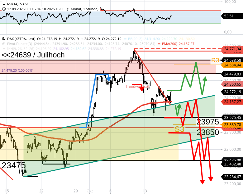 1) Nur wenn der DAX den Bereich 23975/23850 behaupten kann, gibt es zeitnah DAX Anstiegschancen bis 24475. Widerstand des Tages ist der EMA200/h2 bei 24150.