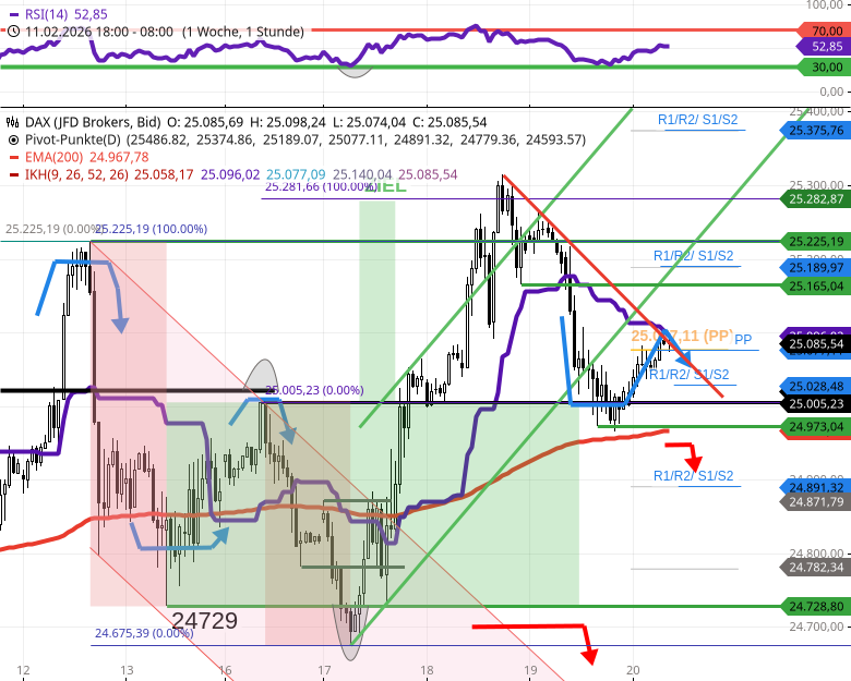 - Der DAX prallt nach Scheitern bei 25096 von 25096 bis zu 25020/25005 nach unten ab.