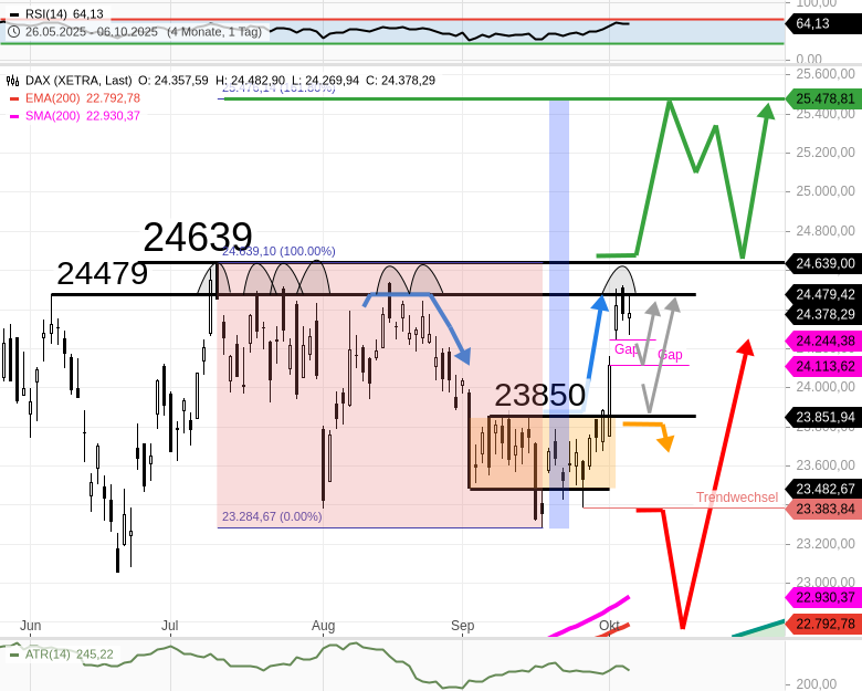 Stark wäre es, wenn der DAX bereits die obere Gap-Begrenzung bei 24247 behaupten kann. - 🟢 BULLISCH: Steigt der DAX per Tagesschlusskurs über das Allzeithoch 24639, schaltet sich das neue Jahresschlusskursziel 25476 frei.