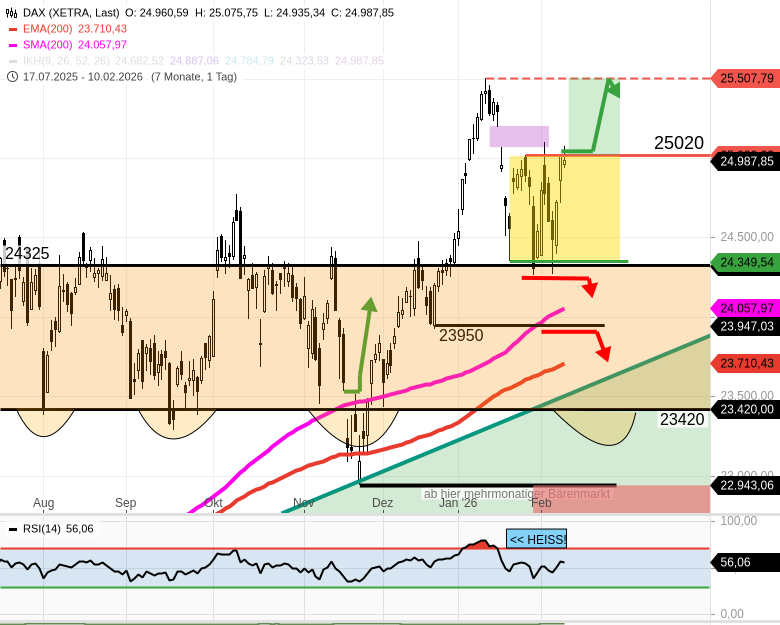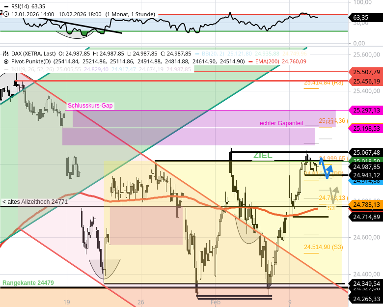 - Es ist klar, dass es um eine große Richtungsentscheidung im Bereich 25020/25070 geht. Der Markt ist unsicher darüber was zu tun ist. Die sehr flache Stagnation seit 9.2.26 17:30 Uhr zeigt es an. Ok, wir wissen also, dass da was im Gange ist, die Aufmerksamkeit aller Marktgruppen ist bei DAX 25020/25070 gefordert.