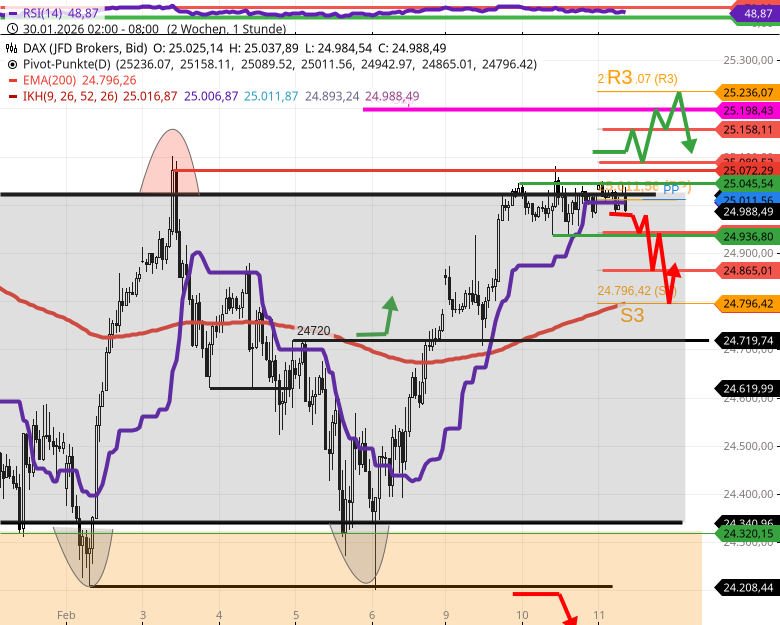3) 🔴 Etabliert sich der DAX heute per Stundenschluss unter 24935, so ist am heutigen Tag mit weitergehenden Abwärtsbewegungen bis ca. 24800/24783 zu rechnen (EMA200/h1+S3+S3).