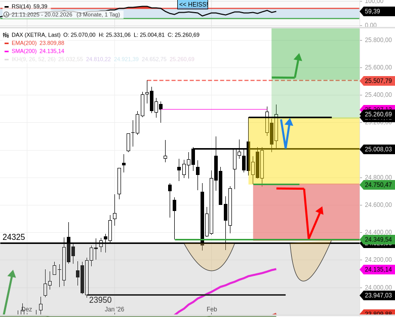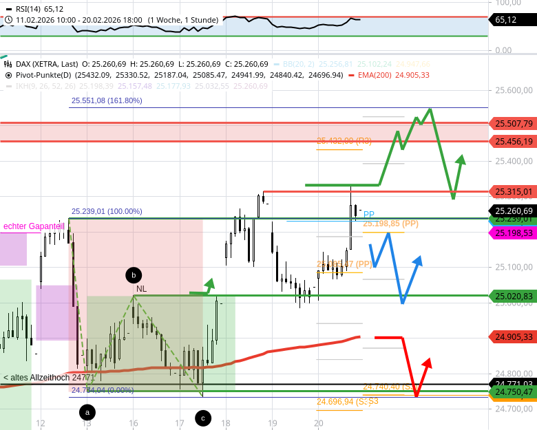 - Unterstützung 24750, zugleich die Marke die den DAX im kurzfristigen Aufwärtstrend hält. - 🟢 BULLISCH: Ein DAX Handel über 25260 macht den Weg frei zum Allzeithoch bei ca. 25500.