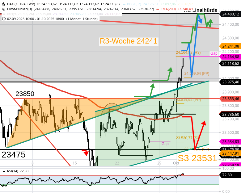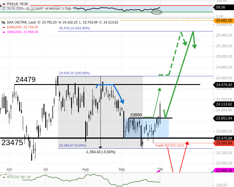 -siehe z.B. 24.9.: "...4) 🟢🟢 Nur nach DAX Tagesschlusskurs über 23850/23875 (besser über 23975), wäre der Abwärtstrend gestoppt und der DAX könnte im Zuge dessen bis 24480 steigen..."