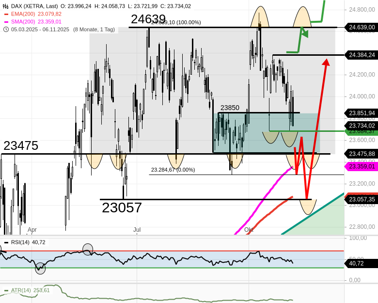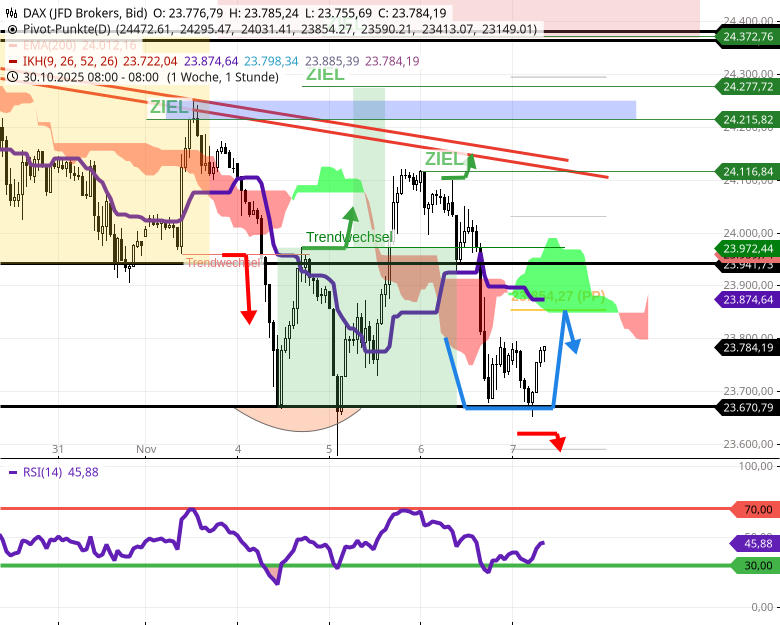 - INTRA DAY: Die DAX Vorbörse zeigt sich über der kritischen Horizontale 23685/23670, was die Chance für einen Bounce zu exakt 23850/23875 eröffnet (Kijun, PP und Wolke), aber nicht für mehr. Verschärfter Abverkauf findet unter 23685/23670 statt.