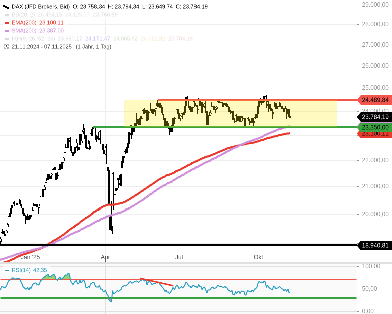 - LIVE DAX (24 Stunden bzw. DAX FUTURE Abbild): Man kann auch erahnen, dass 23350 ein logisches finales Tief innerhalb der Range wäre, wenn der Chart etwas größer aufgezogen wird.