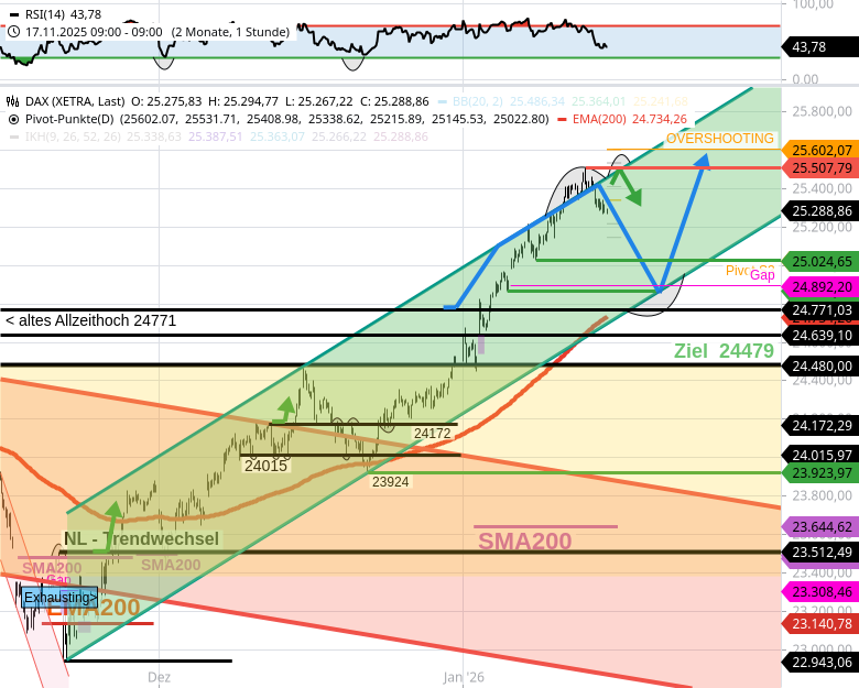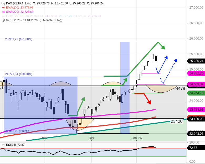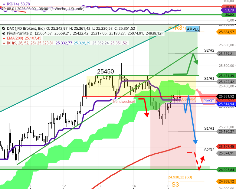 - Der DAX dürfte heute tiefer handeln als gestern und bis 20.1.26 zu 24890/24850 nachgeben. Bedingung: Handel unter 25450.