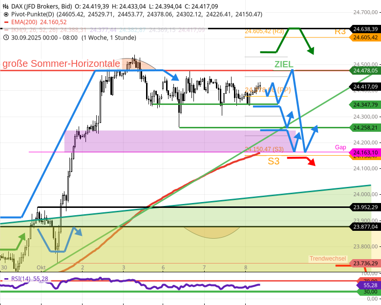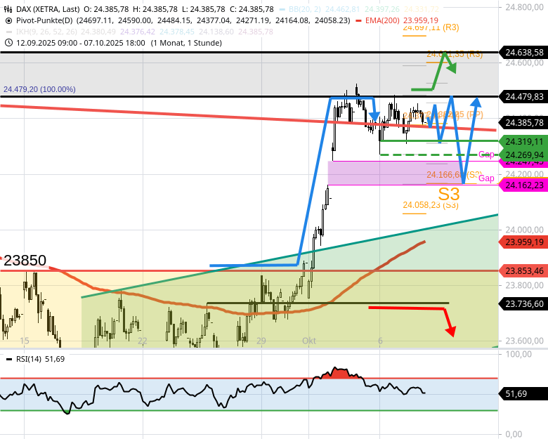 -Stark wäre es, wenn der DAX bereits 24350 bzw. die obere XETRA DAX-Gap-Begrenzung bei 24247 behaupten kann.