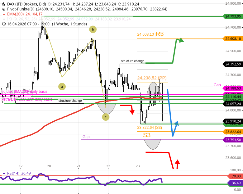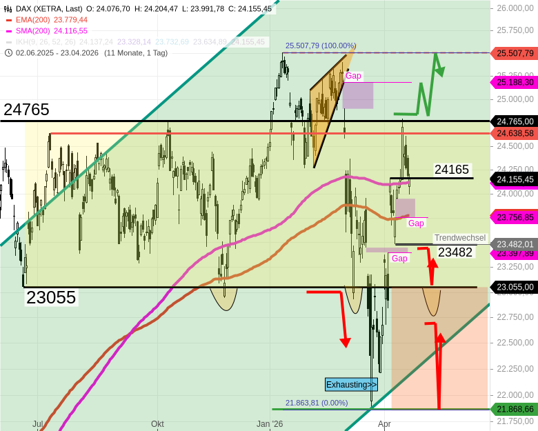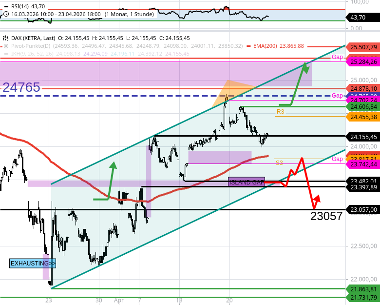 - Der DAX bleibt über 23482 im kurzfristigen Aufwärtstrend. Unter 23482 würde der DAX bis 23400 (island gap) und später bis ca. 23060/23050 fallen.