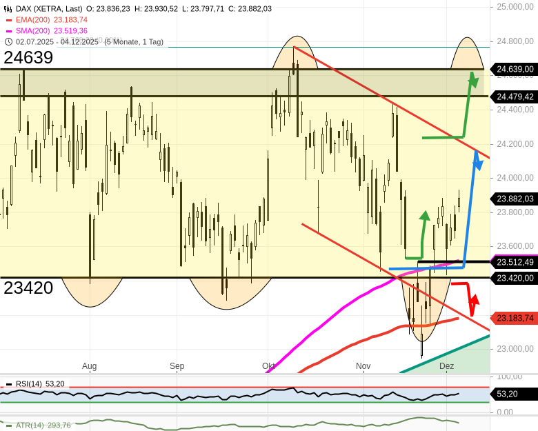 - 3) 🔴 Ein DAX Rückfall unter 23710 und 23662 würde den DAX auf Talfahrt bis 23520 schicken (zum pinken Tageschart-SMA200).