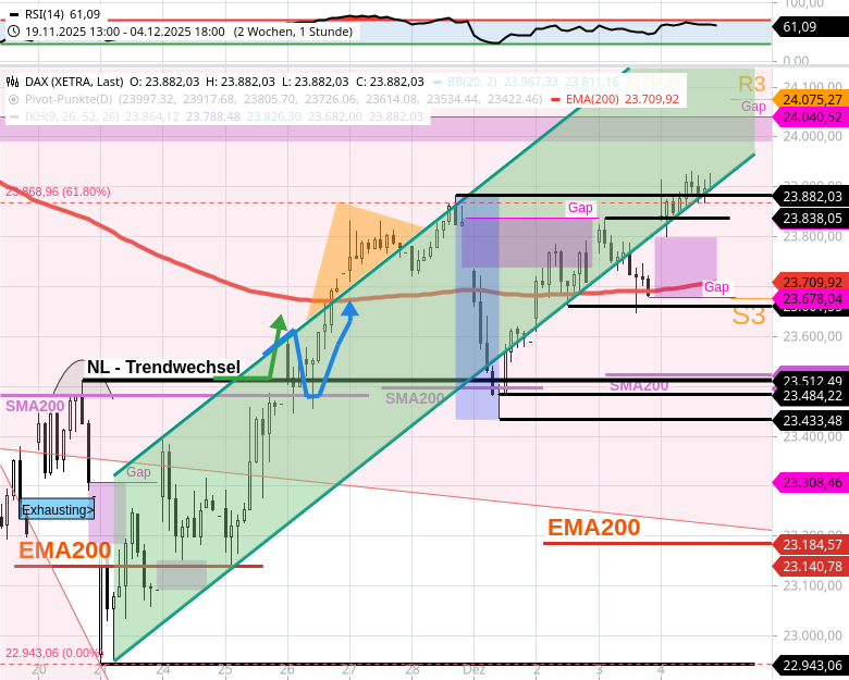 2) 🟢 Über 23884 taktend erhält sich der DAX die Chance auf einen direkten Anstieg bis 24000, 24040 sowie 24075 (R3) und bald auch bis 24200.