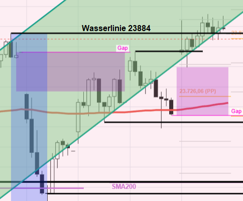 - Für einen Pullback zu neuen tiefer gelegenen Kaufmarken reichte es gestern nicht, obwohl die Ausgangslage dafür am Morgen vorhanden war. Das war stark, obwohl der gestrige Gesamteindruck nur einem Fisch ähnelt, der an der Wasserlinie 23884 aus dem Wasser springen will. DAX Tagesschlusskurs 23882, 2 Punkte unter dem Vorwochenhoch.