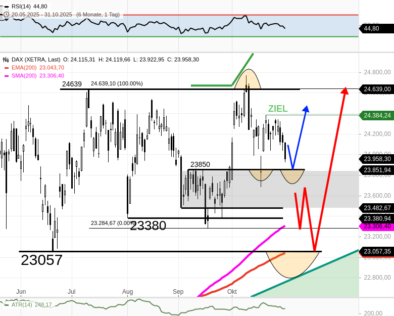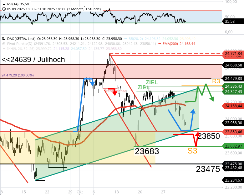 - Am Wahrscheinlichste ist, dass der DAX über dem 10-Tages-Tief 23684 bleibt, konkret spätestens bei 23850 nach oben abdreht und mindestens bis 24330/24384 steigt.