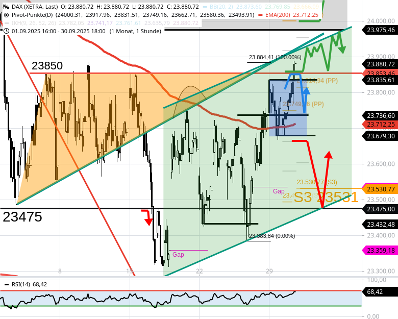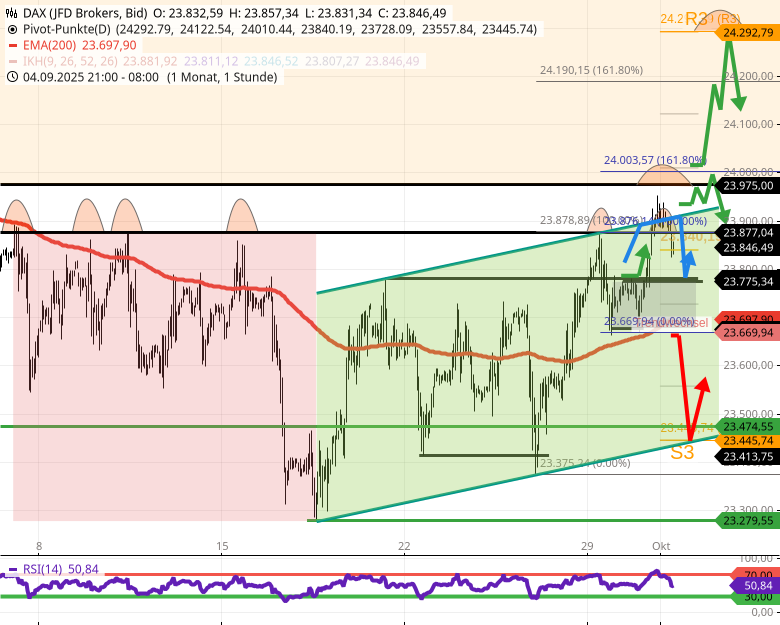- 5) 🔴 Unter 23670 würde es Verkaufssignale geben, was den DAX bis 23475/23450 fallen ließe.