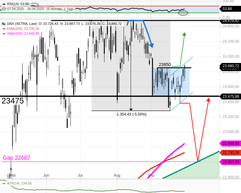 - Heute werden wir im Tagesverlauf zu prüfen haben, ob sich der DAX über der Hürde 23850 etablieren kann und den nächsten Widerstand bei 23975 in Angriff nimmt oder ob nach einem leichten Überschuss zum Quartalsschluss tatsächlich an der tagelang propagierten Entscheidungsmarke Schluss ist und eine Talfahrt Richtung 23475 beginnt.