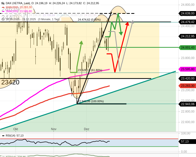 Gibt der DAX unter 24063 nach, dann wäre 24000 das Ziel, um danach wieder neue Anstiegschancen anzumelden.