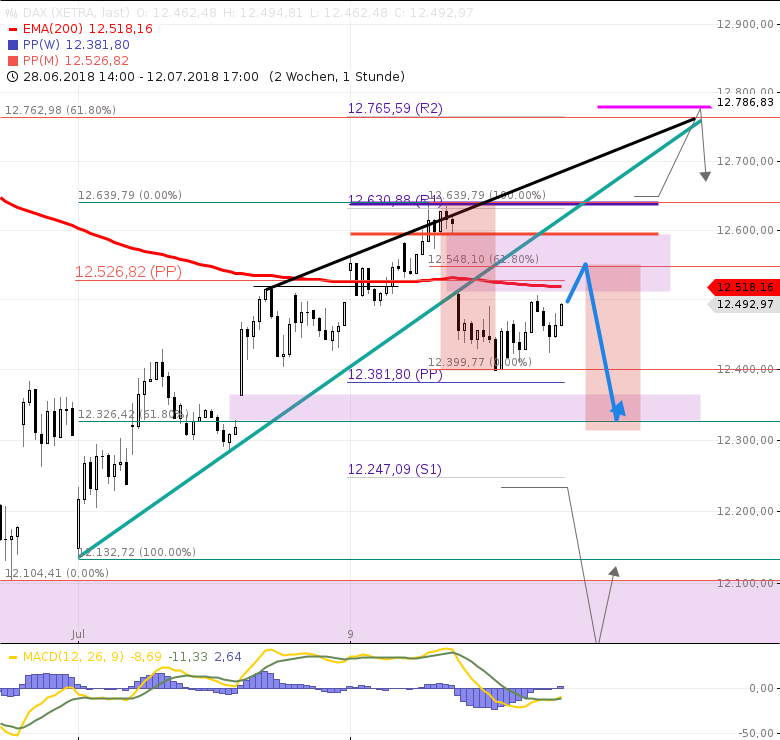 Fazit: Der Zwischenanstieg von 12400 zieht heute alle Register, endet aber in der Regel unterhalb von 12640, idealerweise bei 12548 und spätestens bei 12595, so dass sich bald eine 2. Abwärtsstrecke zu 12325 zeigt. Das wäre nur über 12640 hinfällig.