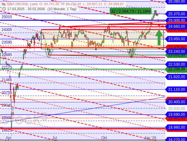 Die Hochs vom 9. Oktober bei 24.771 sowie vom 10. Juli bei 24.639 Punkten wurden bereits unterschritten. Und bis zum Hoch vom 5. Juni bei 24.479 Zählern war es mit dem gestrigen Tagestief von nur noch 24.507 schon nicht mehr weit (siehe grüner Pfeil im Chart).