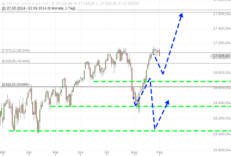 In den USA scheitert der Dow Jones heute an dem Widerstand bei 17.150 Punkten.