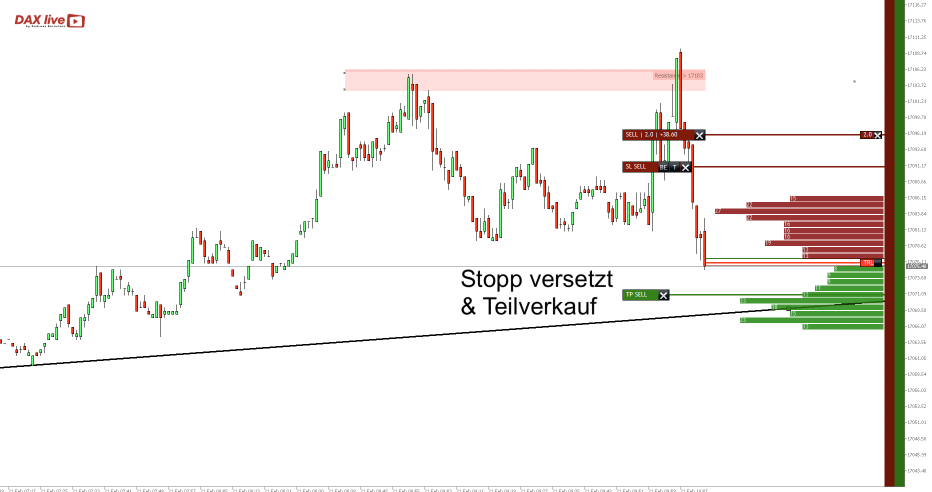 Zunächst wurde die starke Eröffnung jedoch wieder abverkauft und ein Test der Unterseite vollzogen. Im Trading reagierte ich darauf mit folgenden Orders und Zielen: