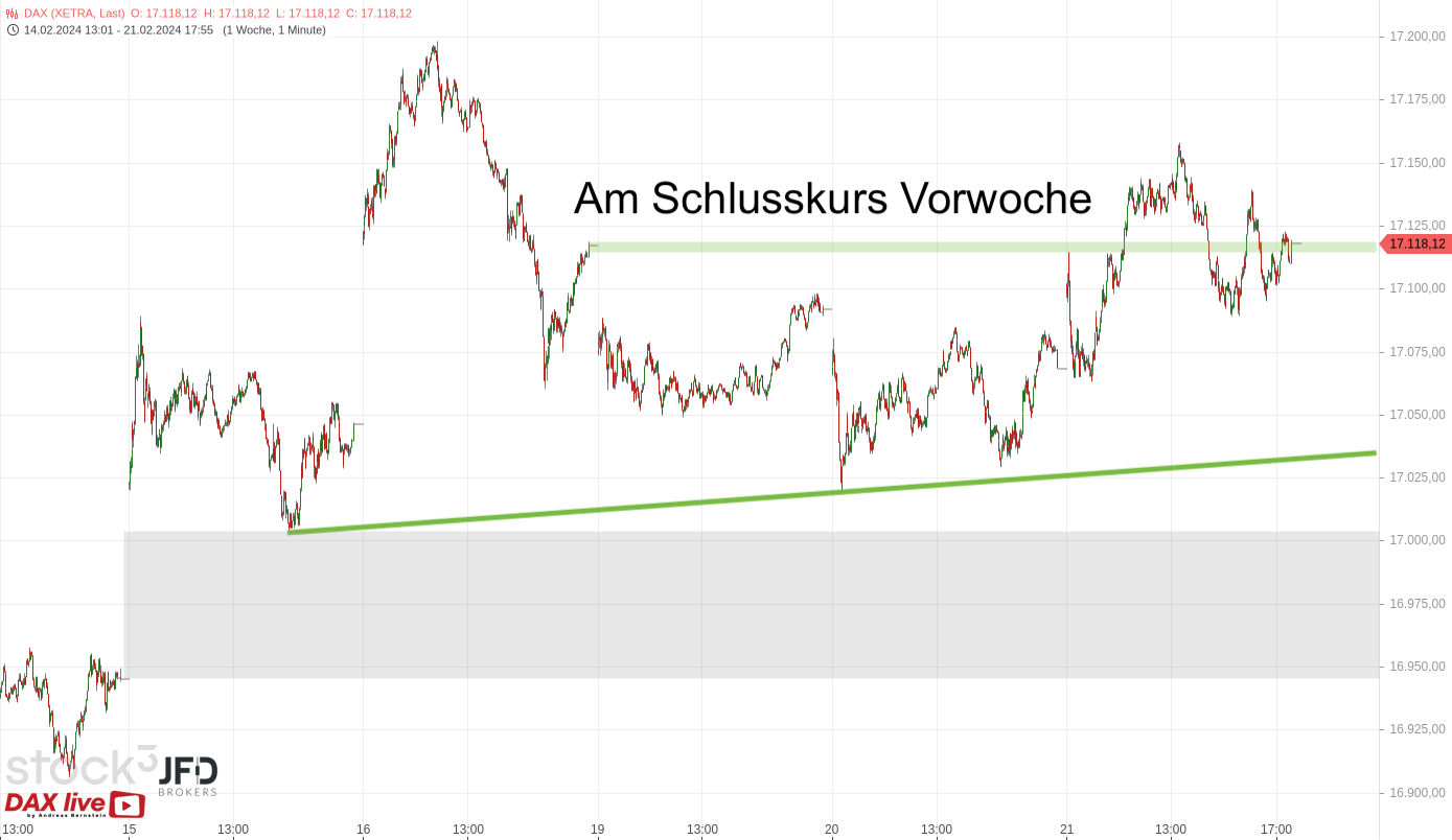 Mehr zum täglichen Livetrading an dieser Stelle - Unterstützung fand er bereits an der Aufwärtstrendlinie, die wir ab dem Tief der Woche im Endloskontrakt einziehen konnte. Ab diesem Punkt stieg der Index dynamisch an und vollzog sogar einen Ausbruch über die Vorwochenschlusskurse.