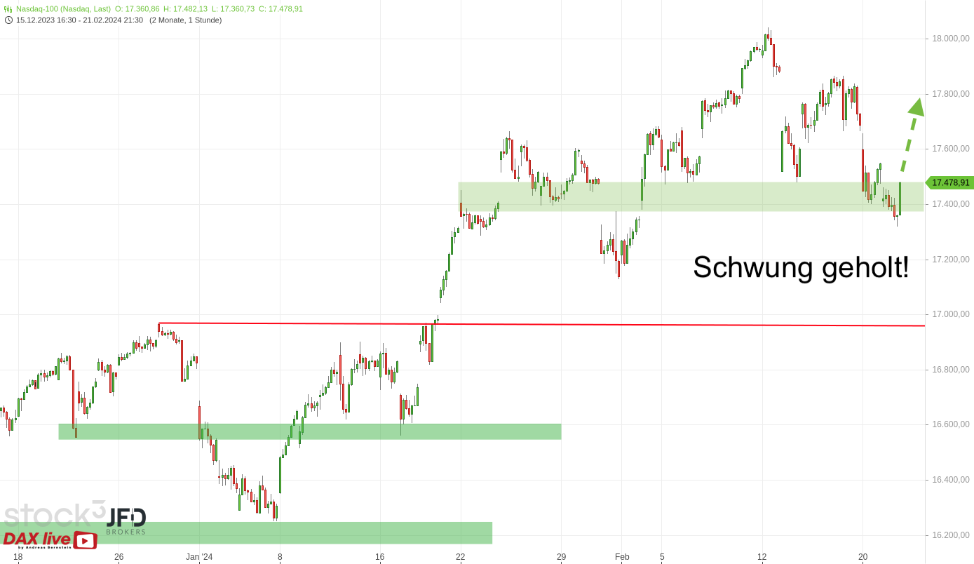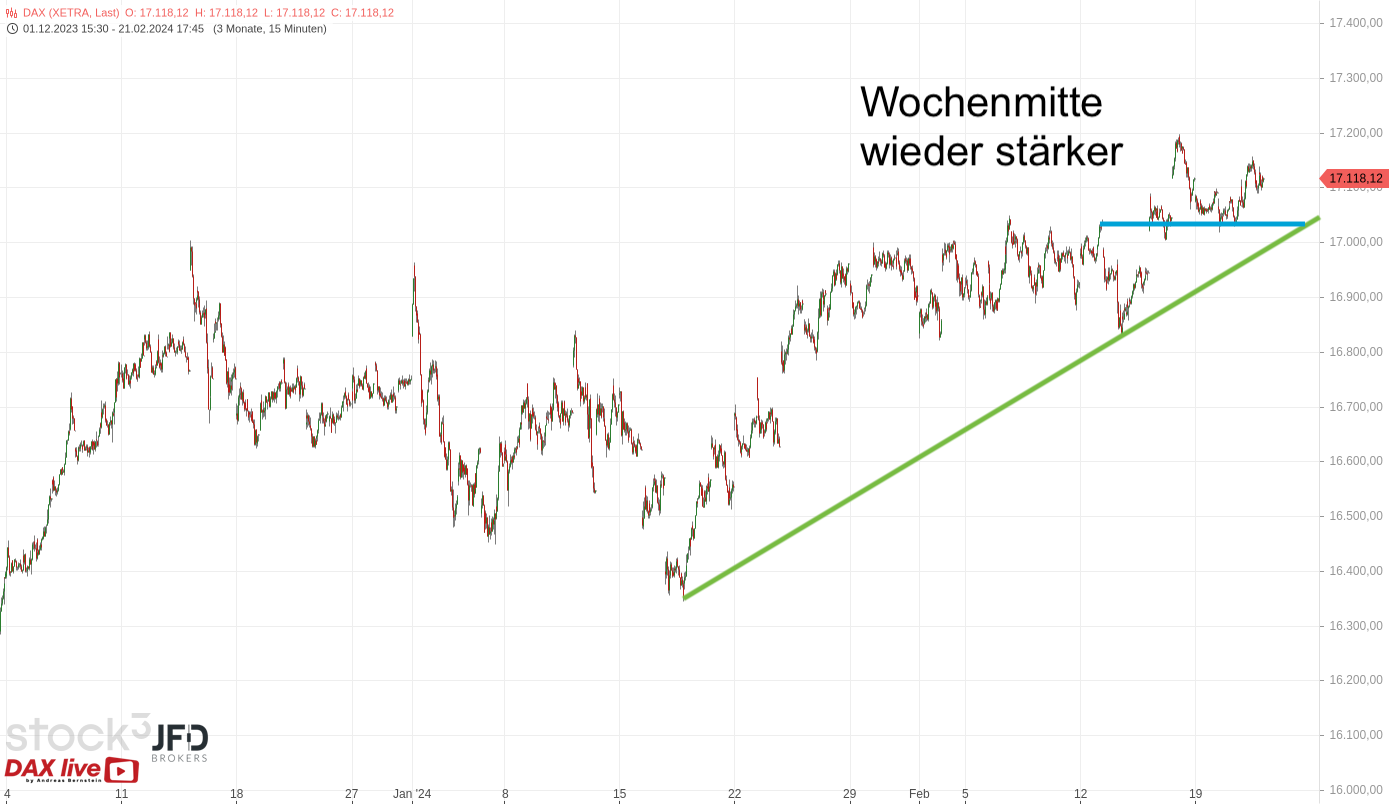 In der Morgenanalyse zum 21.02.2024 war der Schub zur Oberseite sichtbar, den der Index unter geringer Volatilität Richtung Wochenmitte andeutete (Rückblick):