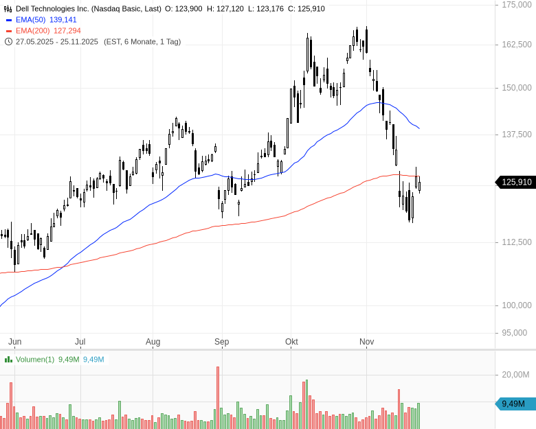Für das vierte Quartal plant Dell Umsätze von 31 bis 32 Mrd. USD (erwartet 27,66 Mrd. USD). Die KI-Serverauslieferungen sollen auf 9,4 Mrd. USD steigen, womit sich die Jahresmenge auf rund 25 Mrd. USD erhöht – ein Plus von über 150 %. Das Ergebnis pro Aktie soll bei etwa 3,50 USD liegen. Für das Gesamtjahr peilt Dell 111,7 Mrd. USD Umsatz (+17 %) und ein Ergebnis von 9,92 USD (+22 %, Konsens 9,53 USD) an.