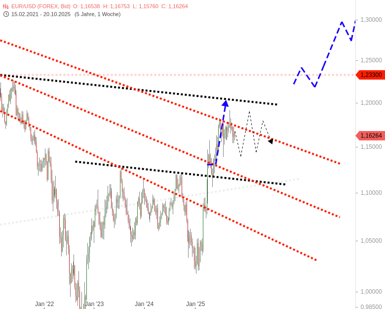 Euro vs US-Dollar - Langfristige Prognoseskizze als Grafiksnapshot - Chartanalyse & Trading - 1 Kerze = 1 Monat