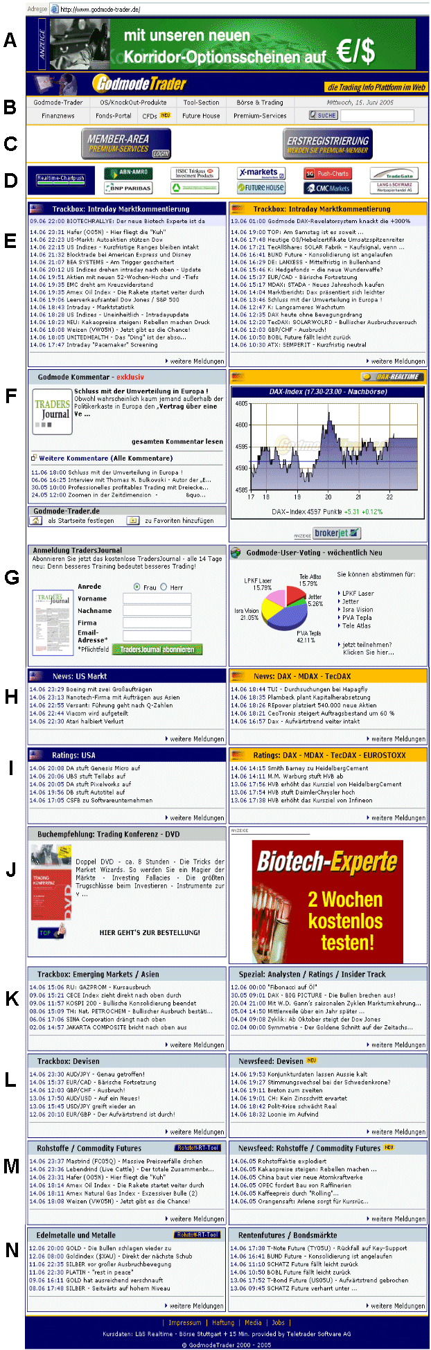 Der Aufbau der Seite ist auf Übersichtlichkeit und schnelles Handling optimiert. Im Folgenden werden die mit den linksseitig angeordneten Buchstaben markierten Bereiche der GodmodeTrader.de Seite erklärt.