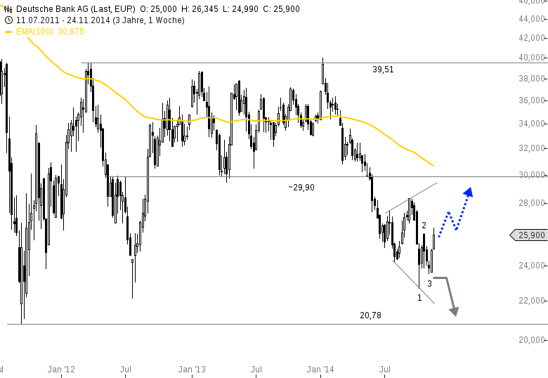 Die gute Stimmung am Aktienmarkt scheint endlich auch die Deutsche Bank Aktie erfassen zu wollen. Immerhin gelang gestern mit dem Kursanstieg über 26,00 Euro die Vollendung eines kleinen 123-Tiefs im Tages- und Wochenstart. Als bullisches Umkehrmuster suggeriert dieses weiter anziehende Notierungen, zumal die Käufer den großen langfristigen Unterstützungsbereich bis hin zu 20,78 Euro auf ihrer Seite hätten. Demnach wäre das nächste größere Ziel der Widerstandsbereich um 29,90 Euro.