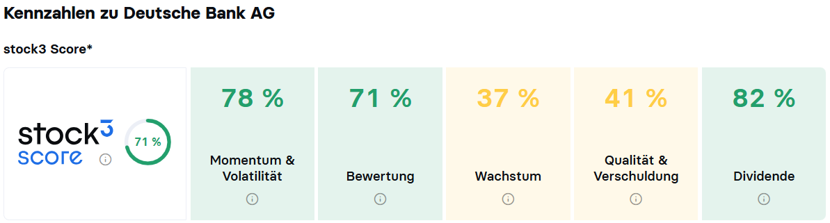 Fazit: Die Deutsche Bank hat für das Jahr 2025 und das vierte Quartal Rekordzahlen gemeldet. Vor allem die Investmentbank entwickelte sich stark, aber auch im Privatkunden- und Fondsgeschäft sowie in der Unternehmensbank sprudeln die Gewinne. Die Deutsche-Bank-Aktie schneidet im stock3 Score mit 71 % weiter überdurchschnittlich gut ab und kann vor allem mit einem hohen Kursmomentum, einer relativ günstigen Bewertung und einer attraktiven Dividende punkten.