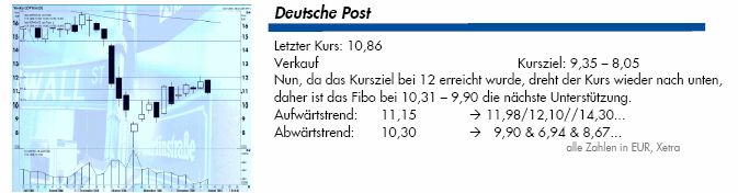 Für die Aktien der Deutschen Post bedeuten diese beispielsweise, dass sich diese im Verkaufsmodus mit Zielen bei 9,35 Euro bis 8,05 Euro befindet. Bestätigt wird dieser Abwärtstrend unter 10,30 Euro mit weiteren Marken dann bei 9,90 Euro, 8,67 Euro und 6,94 Euro. Auf der Oberseite werden über 11,15 Euro folgende Kursbereiche aktiviert: 11,98 Euro, 12,10 Euro und dann 14,30 Euro.