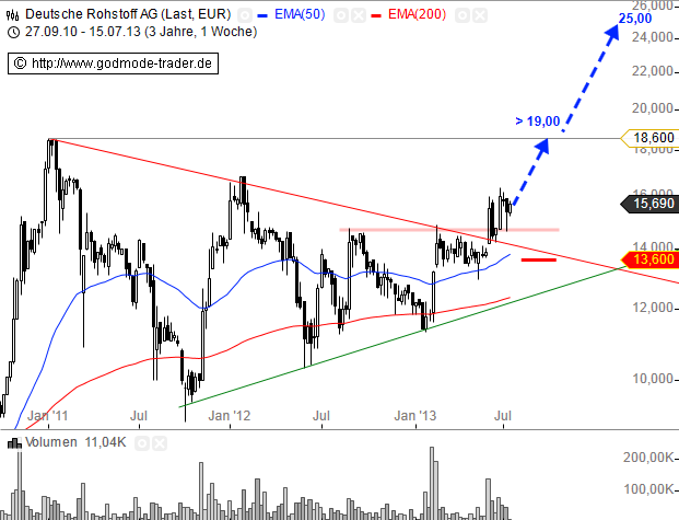 Die Aktie der Deutschen Rohstoff AG konnte Anfang Juni dynamisch und unter hohen Umsätzen über den Widerstandsbereich bei 14,60 - 14,90 Euro ausbrechen und damit ein mittelfristiges Kaufsignal generieren. Jetzt läuft eine Konsolidierung oberhalb des Ausbruchslevels. Ein weiterer Rallyschub in Richtung Allzeithoch bei 18,60 und darüber hinaus mittelfristig ca. 25,00 - 26,00 Euro könnte prinzipiell direkt starten.