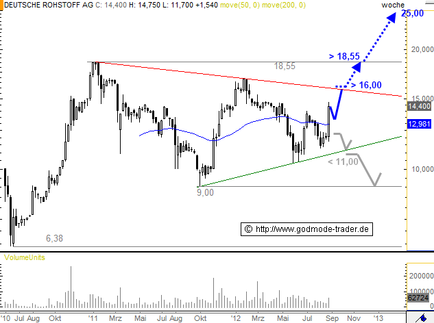 Nach einem Gutachten der Deutschen Rohstoff AG, einem Produzent von Rohstoffen mit Schwerpunkt in Deutschland und anderen politisch stabilen Ländern, schlummern im Erzgebirge große Vorkommen an Zinn. Diese Meldung führt heute zu einem starken Kurssprung von aktuell 11,86%. Innerhalb der großen, dreiecksförmigen Seitwärtsbewegung seit 2011 nähert sich der Wert nun der Oberkante bei ca. 16,00 Euro, welche jetzt das nächste Ziel darstellt. Oberhalb davon ist Platz bis zum Allzeithoch bei 18,55 und darüber hinaus mittelfristig ca. 25,00 - 26,00 Euro.