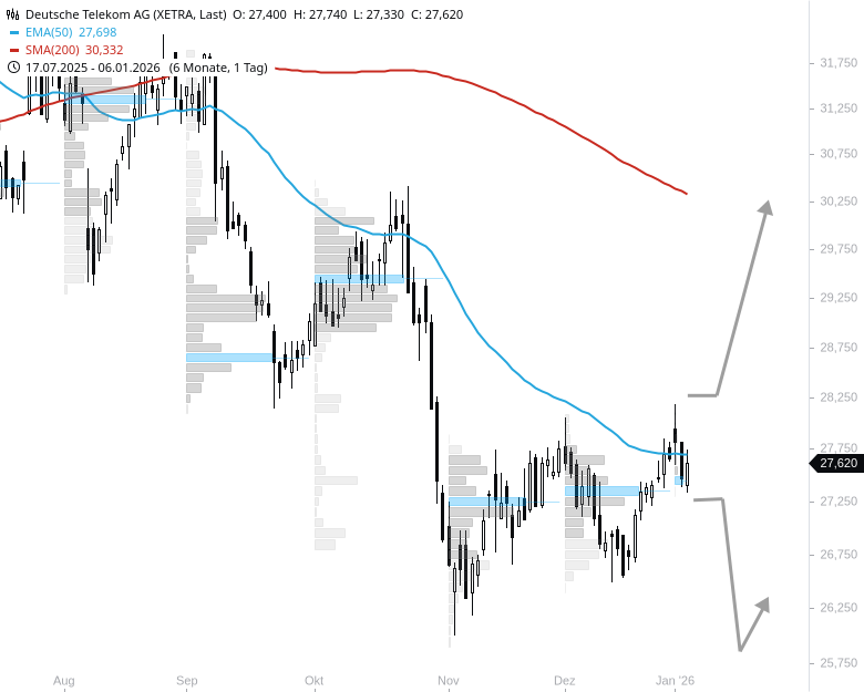 Zum Jahresstart ist die Deutsche Telekom Aktie an den Märkten weiterhin in der Beobachterrolle: Die Aktie läuft am Montag und Dienstag knapp seitwärts bis leicht negativ, verliert wieder etwas an Momentum und fällt unter den Widerstandsbereich ab ca. 28 EUR zurück. Gleichzeitig sendet das Unternehmen fundamentale Signale an die Märkte: Ein bis zu 2 Mrd. EUR schweres Aktienrückkaufprogramm wurde gestartet, das den Gewinn je Aktie stützen soll und Aktionärsinteresse wecken kann. Zudem bestätigen Analysten, etwa von UBS, ihre Kaufempfehlung mit einem Kursziel deutlich oberhalb des aktuellen Niveaus – ein bullisches Fundament, das Mut machen kann.