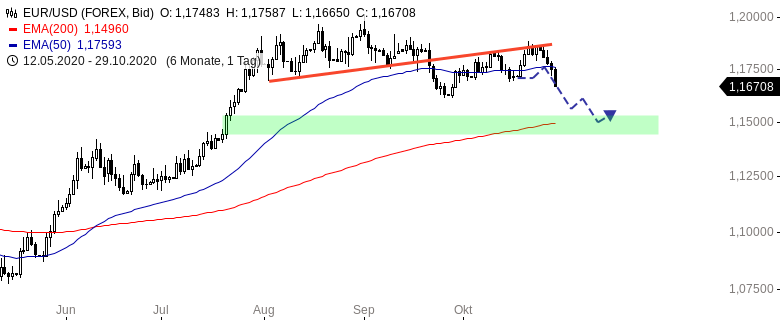 EUR/USD lief nach der Betrachtung tatsächlich noch einmal an die skizzierte Nackenlinie der Topformation, konnte diese aber wie favorisiert nicht nachhaltig überwinden. In den vergangenen Tagen ging es dann wieder ein bis zwei Etagen tiefer.