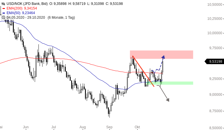 USD/NOK rutschte nach der Analyse vom 15.10. noch einmal in Richtung der Horizontalunterstützung um 9,20 NOK ab, konnte sich aber dort stabilisieren. Ausgehend von diesem Level kam dann schlussendlich die favorisierte Aufwärtsrally.